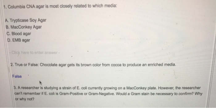 Microbiology Quiz 2 at University of Minnesota - Twin ... from classconnection.s3.amazonaws.com Anaerobic cna agar base is a modification of columbia cna agar base with additional enrichment supplements i.e. Principles of the procedure the nitrogen, vitamin, and carbon sources are provided by enzymatic digest of animal. Specimen types bd modified cna agar is a selective medium for many gram positive bacteria in aerobic bacteriology and can be used for all types of bacteriological specimens. Гидролизат казеина, ферментный гидролизат из животных тканей. Columbia cna agar is not intended for use in the diagnosis of disease or other conditions in. Columbia cna agar is used as a primary 3 plating medium for urine cultures. It is a mixture of agarose and. Fra i principali microrganismi che hanno.